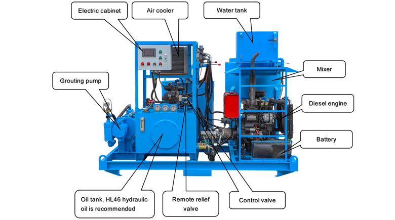 1. 柴油全液壓驅動。 2. PLC 和 HMI 控制。 3. 攪拌器和攪拌器開關為擠壓手柄,操作方便可靠。 4. 雙缸柱塞泵,確保漿液連續(xù)流動(脈沖?。c雙作用柱塞泵相比,不易泄漏。 5. 注漿壓力和產(chǎn)量無級可調。 6. 液壓油超溫保護。 7. 具有計數(shù)器記錄和顯示注漿泵往復次數(shù)的功能。 8. 固態(tài)繼電器。