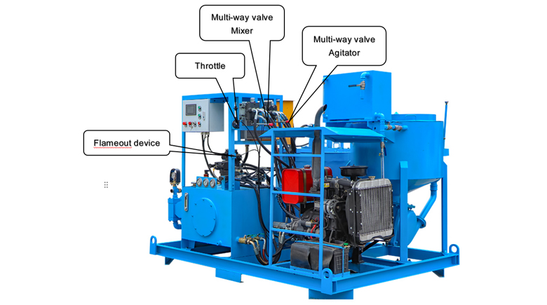 高速高剪切膠體攪拌器產(chǎn)生渦流,確保快速均勻混合。水、水泥或膨潤土快速混合成均勻的漿液。然后將混合漿液輸送到攪拌器。灌漿泵從攪拌筒(儲罐)注入。這確保了連續(xù)的混合和灌漿操作。灌漿設備采用電動液壓驅動。灌漿壓力和排量可調。體積小巧,操作方便。占用空間小。
