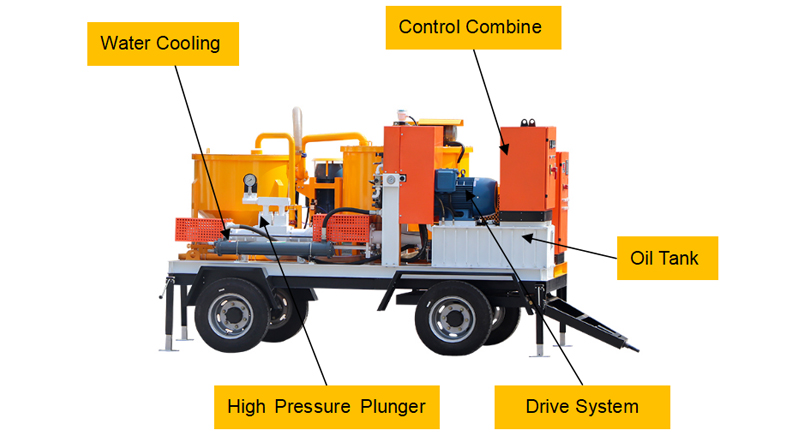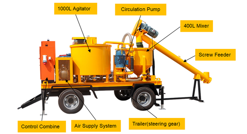 | 1.攪拌站 1.1氣動夾管閥:漿液流動更順暢; 1.2超聲波液位計:可精確測量攪拌器高度; 1.3 PLC+觸摸屏:手動、全自動兩種方式。 2.注漿泵站 2.1注漿壓力、排量無級可調; 2.2雙注漿柱塞,流量連續(xù)輸出,脈動??; 2.3具有計數(shù)器記錄、顯示注漿泵往復次數(shù)功能; 2.4電機具有過載保護功能; 2.5液壓系統(tǒng)具有油溫過熱保護功能; 2.6電動機、液壓驅動。任何時候,發(fā)生超壓,液壓安全保護都會起作用。 3. 拖車 3.1 具有轉向功能; 3.2 三腳架高度可調。 |