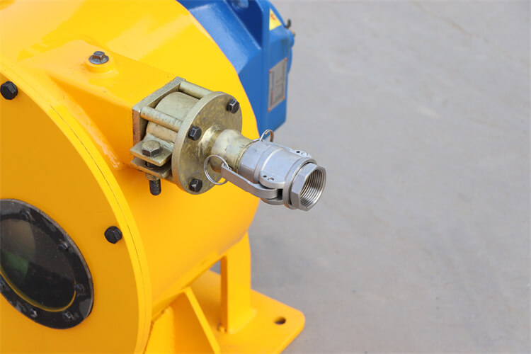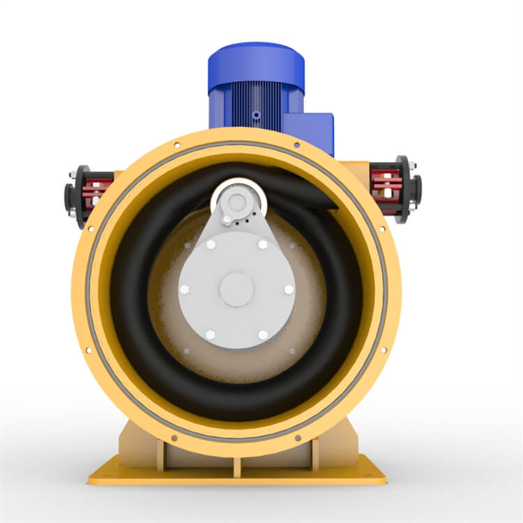當(dāng)轉(zhuǎn)子組帶動(dòng)單個(gè)滾輪旋轉(zhuǎn)時(shí),膠管受到擠壓變形,滾輪旋轉(zhuǎn)后,變形的膠管依靠自身的彈性恢復(fù)原狀,從而在該膠管內(nèi)產(chǎn)生負(fù)壓,將漿體吸入,并在滾輪的推動(dòng)下通過輸出口排出,最終形成漿體的壓力輸送。