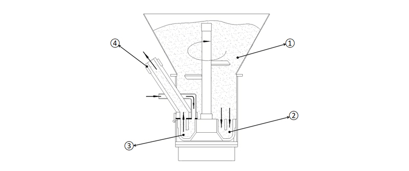 ③ 隨著壓縮空氣的引入,混合物從進(jìn)料輪袋中抽出,然后通過(guò)出口進(jìn)入軟管。